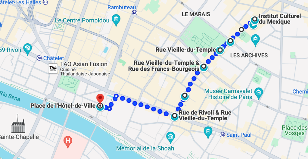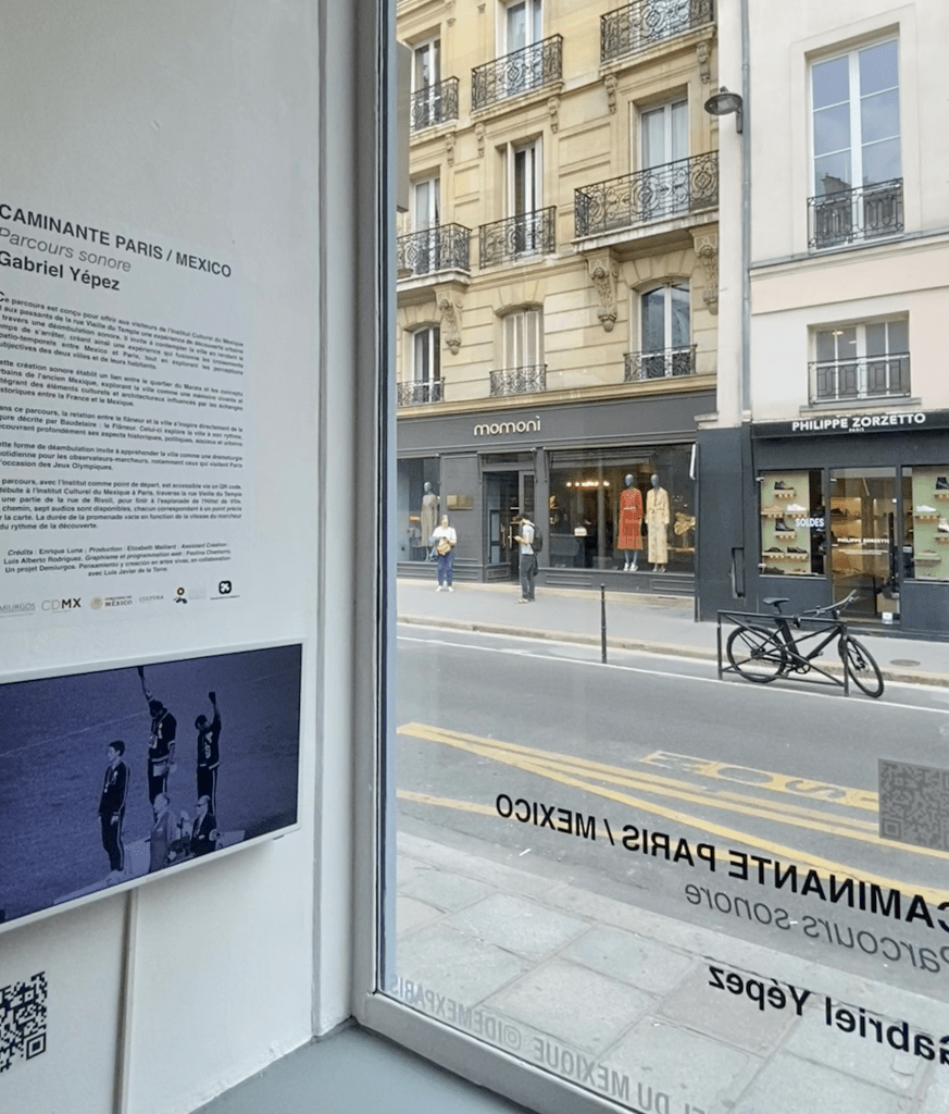 Le parcours, dont l’Institut est une des étapes, peut être téléchargé via un QR code. Il commence à l’Institut Culturel du Mexique à Paris, suit la rue Vieille du Temple, une partie de la rue de Rivoli et se termine à l’esplanade de l’Hôtel de Ville. En chemin, sept audios sont disponibles, chacun correspondant à un point précis sur la carte. La durée du parcours varie selon la vitesse du marcheur et la continuité de la promenade.